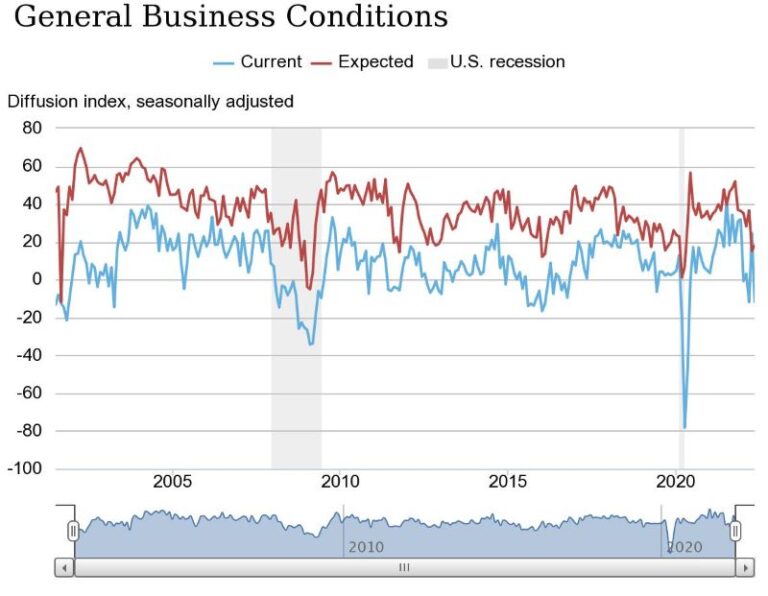 The Empire State Manufacturing Survey general business-conditions index plunged 36 points to -11.6, pointing to contraction in manufacturing activity. The index — the monthly gauge