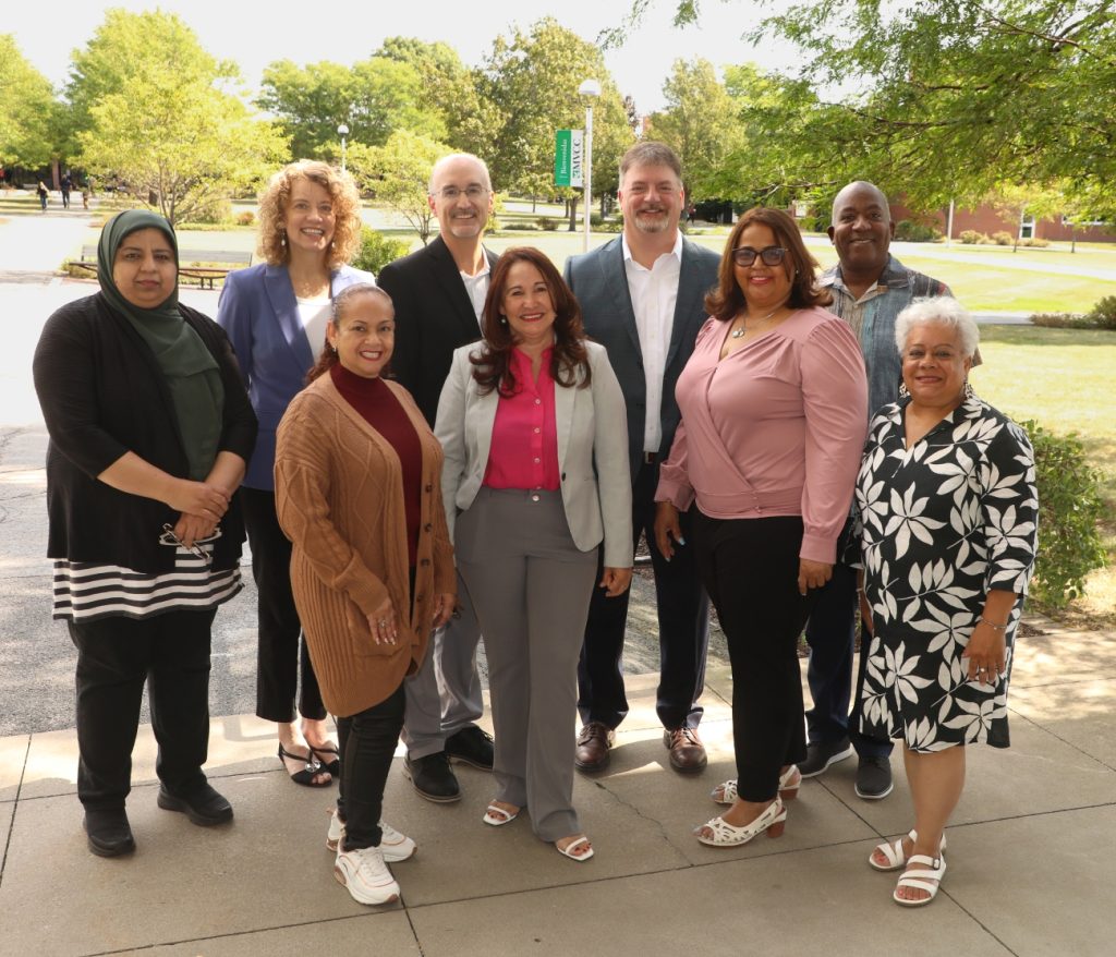 Faculty members from Autonomous University of Santo Domingo (UASD) in the Dominican Republic visited Mohawk Valley Community College (MVCC) earlier in September to learn about strengthening STEM (science, technology, education, mathematics) education. Pictured here in the front row (from left to right) are: Gladys Nunez, Rosa Almonte, and Reina Raveras from UASD; and C. Sonia Martinez, executive director of the Mohawk Valley Latino Association. In the back row (from left to right) are: Shahida Dar, interim dean of the MVCC School of STEM Transfer; Jennifer DeWeerth, dean of the MVCC Rome campus and community outreach; Randall VanWagoner, president of MVCC; Jake Mihevc, assistant VP of learning and academic affairs at MVCC; and Todd Marshall, executive director of equity and inclusion at MVCC. (Photo credit: MVCC)