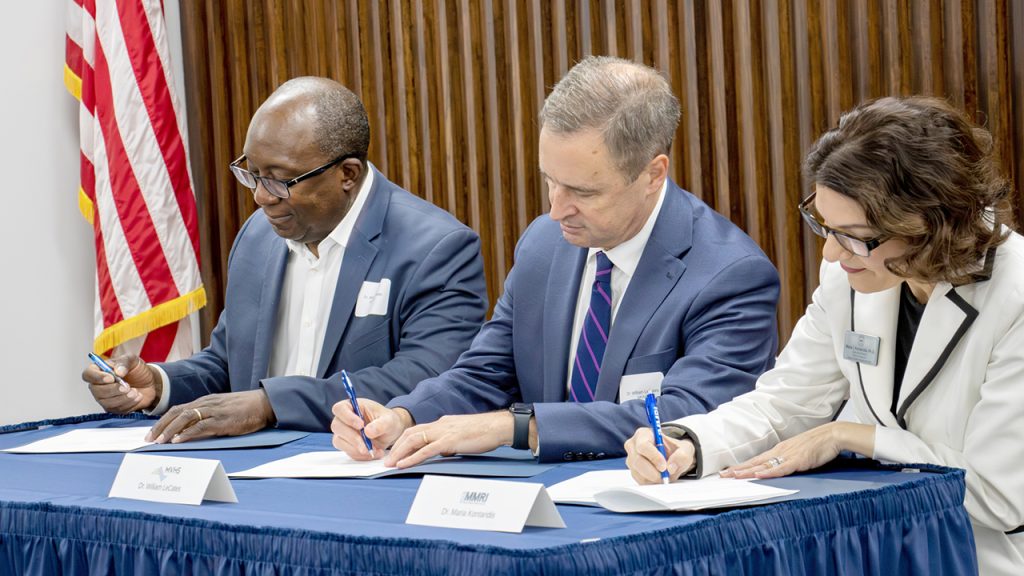 Three prominent Mohawk Valley (MV) institutions have formed the MV Biotech Collective. Pictured at the signing ceremony, from left to right, are: Winston Soboyejo, president of SUNY Polytechnic Institute in Marcy; Dr. William LeCates, president and CEO of Mohawk Valley Health System (MVHS) in Utica; and Maria Kontaridis, executive director of the Masonic Medical Research Institute (MMRI) in Utica. PHOTO CREDIT: MMRI