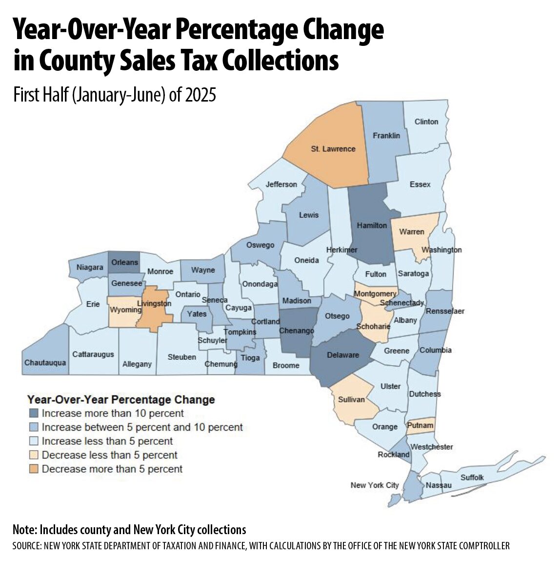 Among the eight counties that had decreases in first-half collections, St. Lawrence had the steepest decline at -5.7 percent, followed by Livingston (-5.1 percent) and both Sullivan and Schoharie (-2.9 percent).