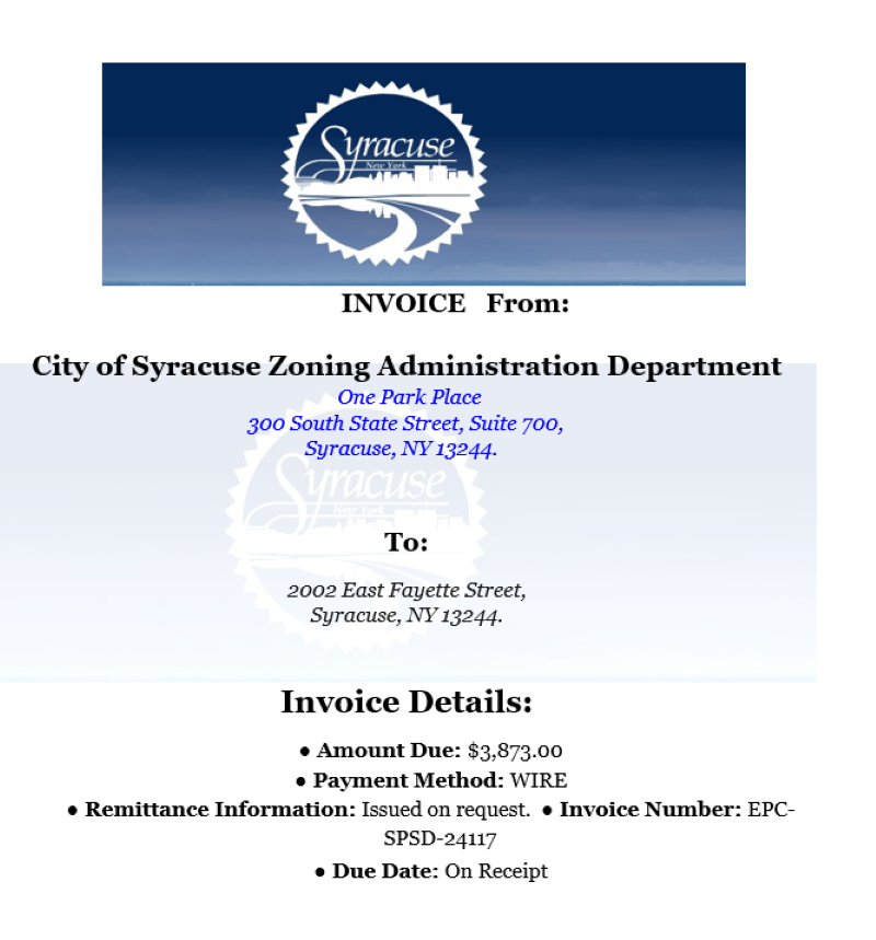 If you have questions about city zoning fees, or receive an invoice in the mail, please contact the City of Syracuse Division of Code Enforcement at (315) 442-8695 to ensure the invoice is legitimate.