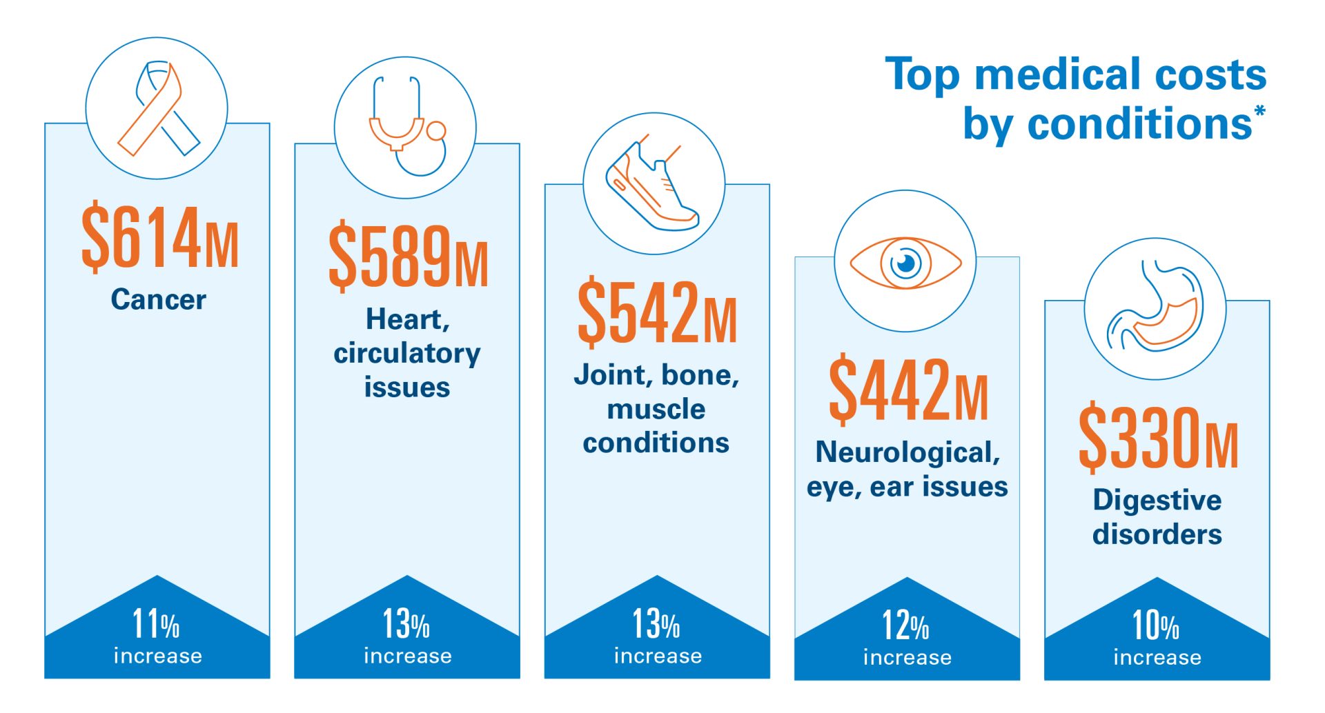 *”Top Medical Costs by Conditions” include medical claims for fully-insured health plans, excluding prescription drug claims. The cost data in this section reflects claims incurred for a 12-month period ending November 2024 (paid through January 2025). Medical costs are also compared to the same period from the previous year.